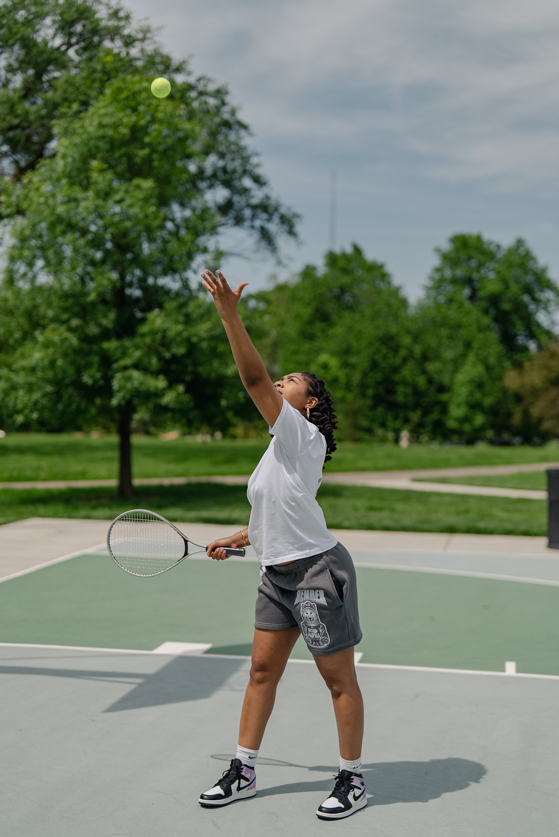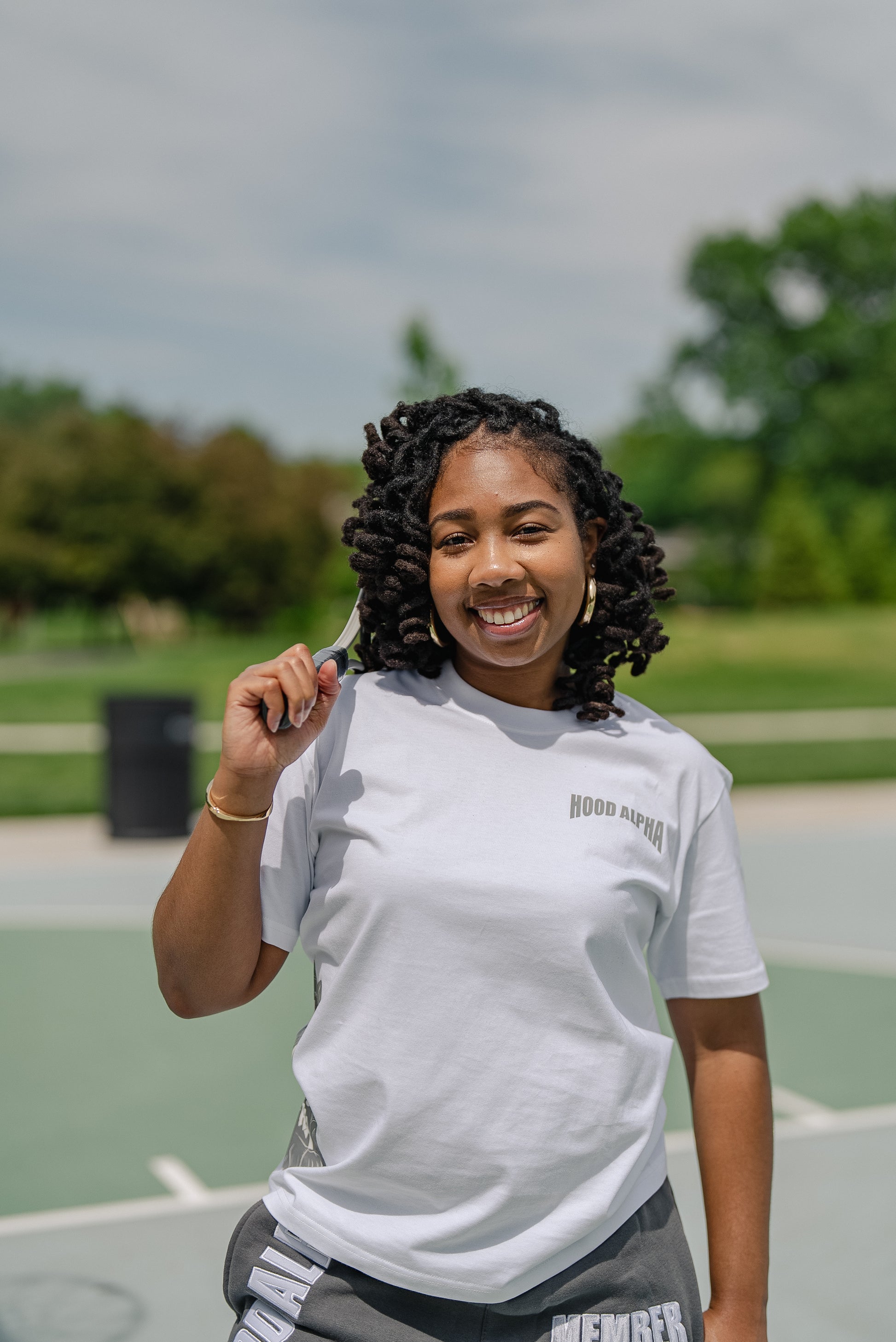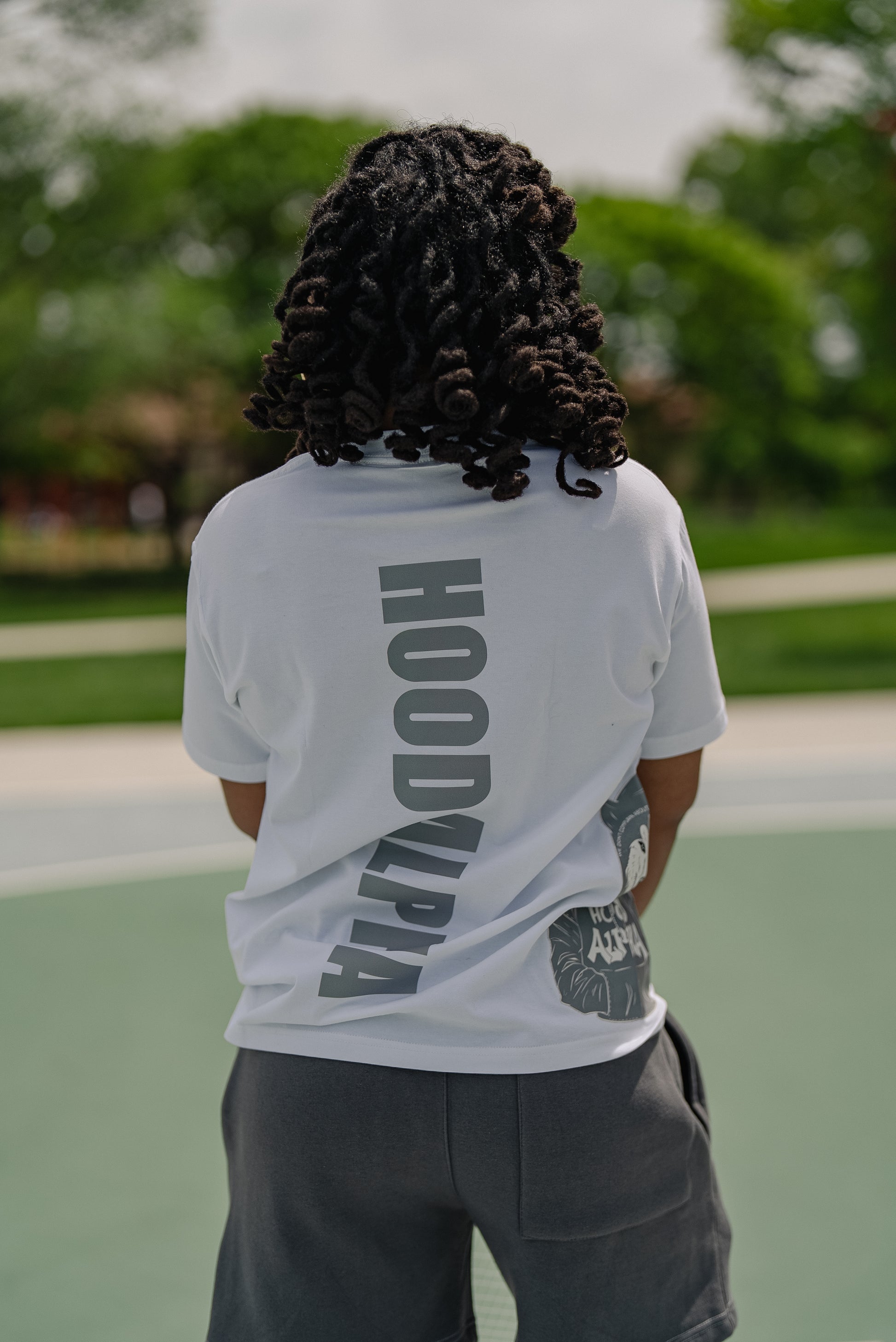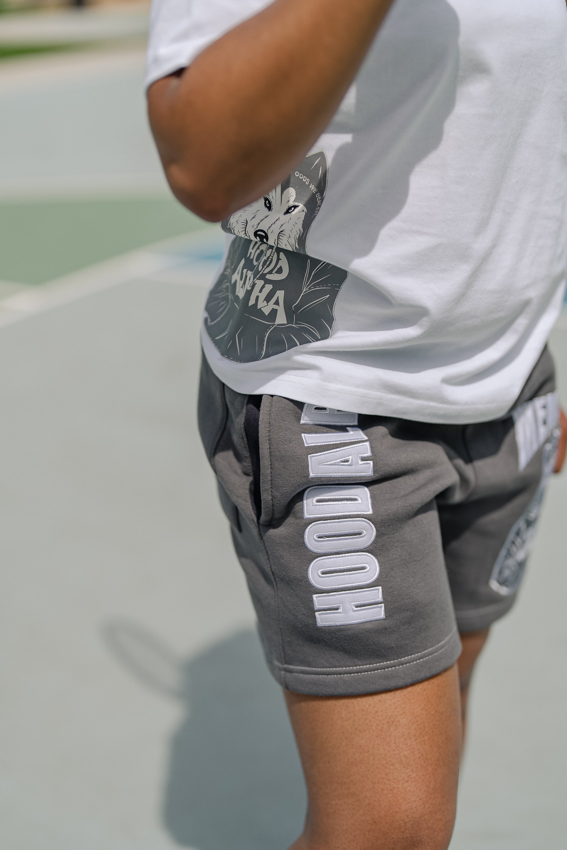 Gray 100% cotton shorts with white stitching, bold white brand name and wolf logo on the front. Includes back pocket. Paired with a white shirt with gray embroidery and wolf logo on the side. Shirt fits slightly oversized.