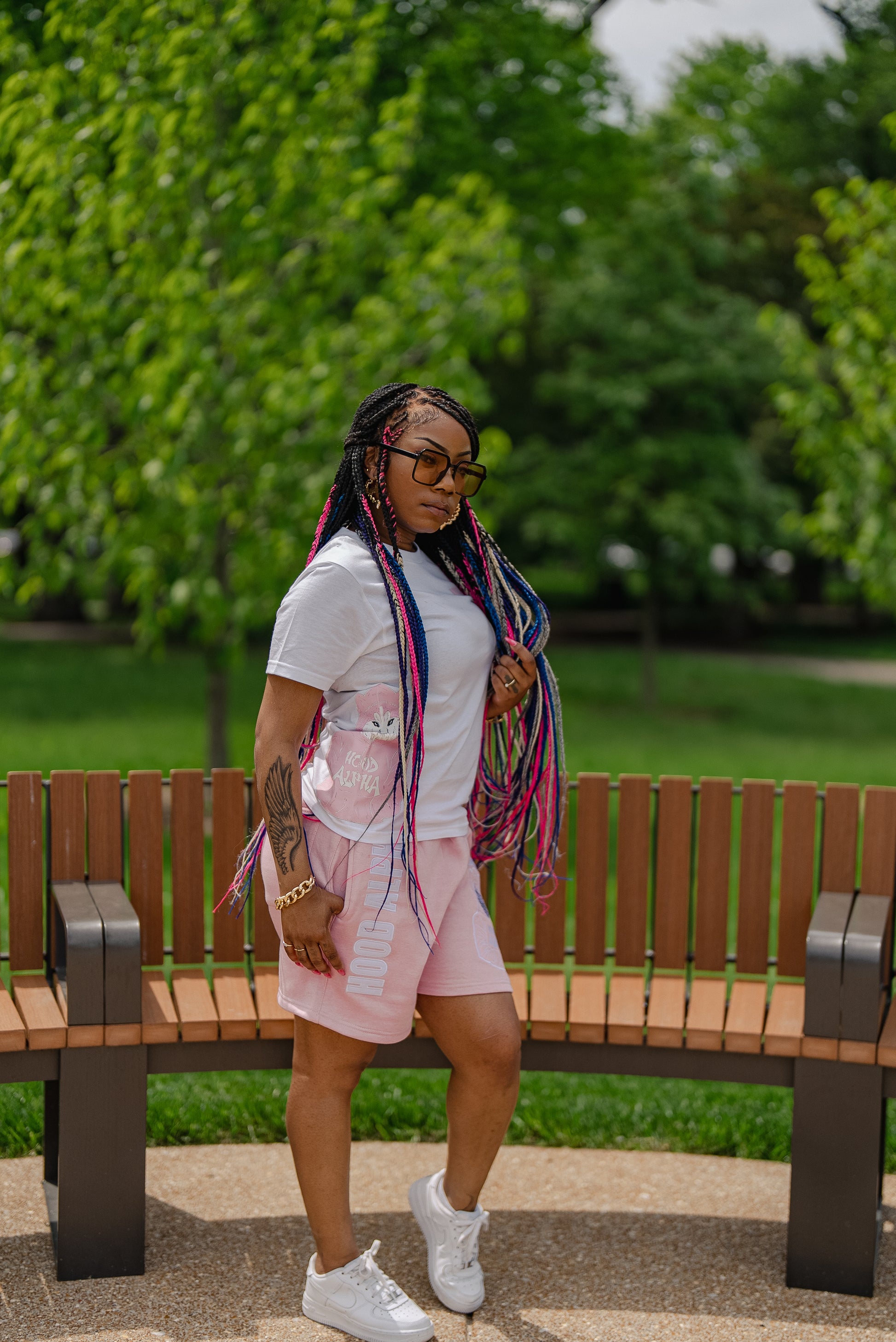 Pink 100% cotton shorts with white stitching, bold white brand name and wolf logo on front. Back pocket included. Paired with a white shirt featuring pink embroidered logo and wolf design. Shirt fits slightly oversized.